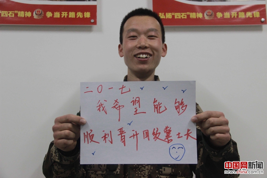 武警交通七支队上士李银亮。2017年,他将要面临复转退,上士最后一年的他早已习惯了部队正规有序的生活,很希望能够在2017年顺利晋级,成为四级警士长,继续为部队做贡献,无怨无悔。