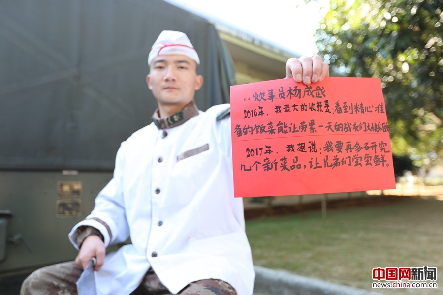 炊事员杨成武:2016年,最大的收获就是看到精心准备的饭菜能让劳累一天的战友们大快朵颐。2017年,我要再多研究几个新的菜品,让兄弟们尝尝鲜。