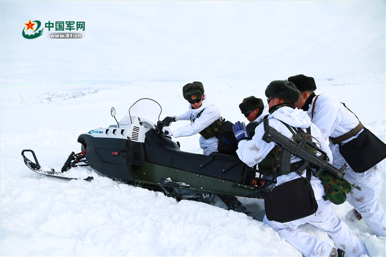 执勤官兵将摩托雪橇从雪中推出。