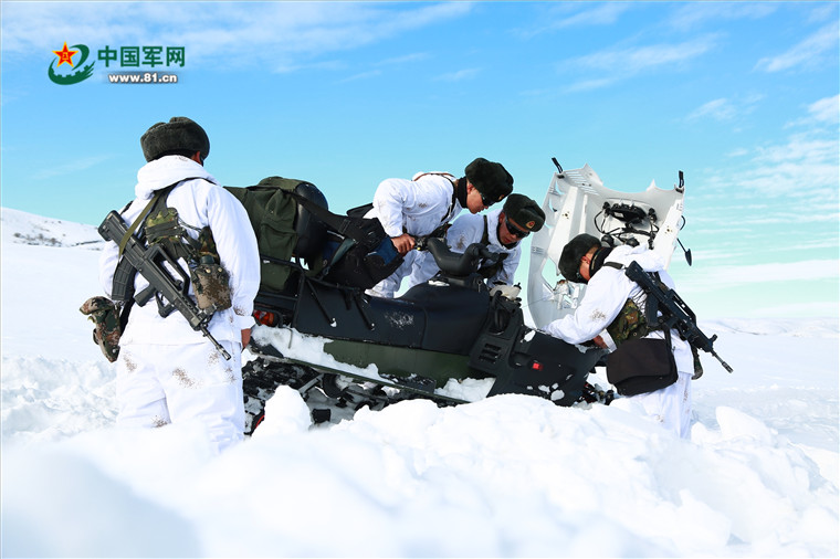 执勤官兵仔细检查摩托雪橇性能。