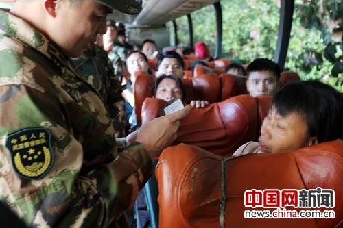 2月13日,惠州市公安边防支队官兵截停运送非法入境人员大巴后,登车询问登记人员身份信息。顾俊锋 摄