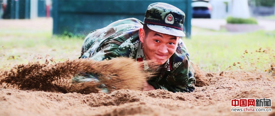 上士孟秋杰为新战友做匍匐前进示范