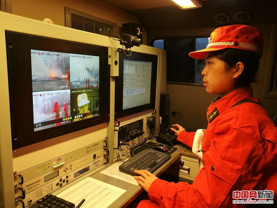 灭火演练时,王菊参谋在进行图像传输