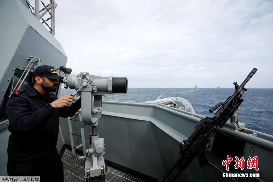 当地时间3月13日,北约在意大利卡塔尼亚海域举行代号为“Dynamic Manta 2017”海军反潜联合演习。图为“Mendez Nunez”号上的舰员观察潜艇动态。