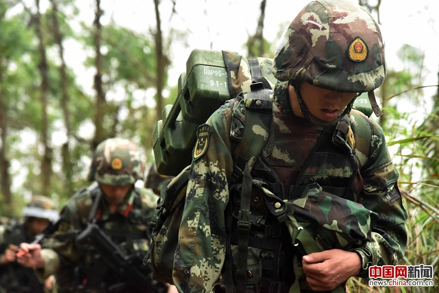 武警特战官兵负重行军。