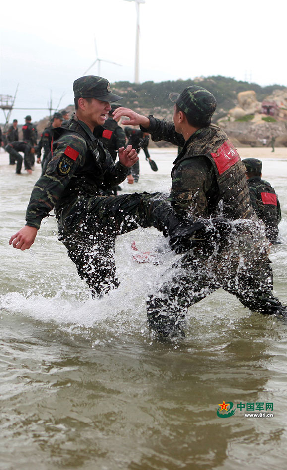 除了红蓝对抗,特战队员在浅滩开展格斗训练。