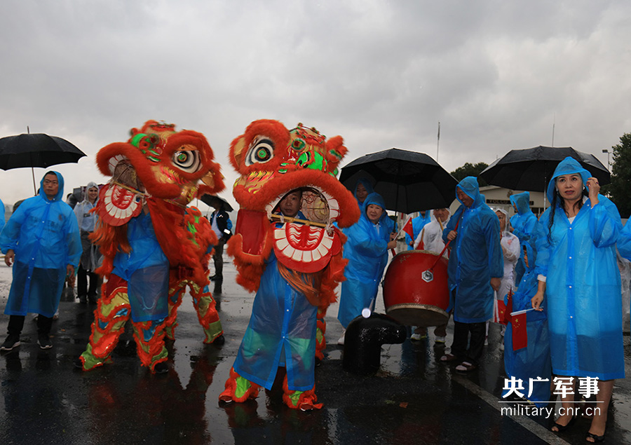 华人华侨冒雨舞狮欢迎编队到访。史奎吉摄