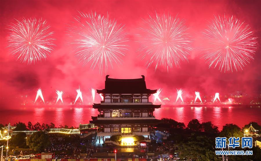 8月1日,焰火在长沙市橘子洲上空绽放。当日是建军节,湖南长沙橘子洲举行《军魂》为主题的焰火晚会,庆祝中国人民解放军建军90周年。新华社发(曹正平 摄)