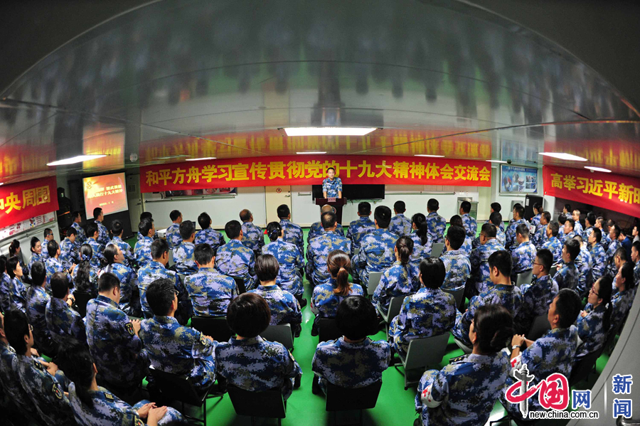 中国海军和平方舟医院船在南非南部海域举行体会交流会,掀起了学习宣传贯彻党的十九大精神热潮。江山 摄