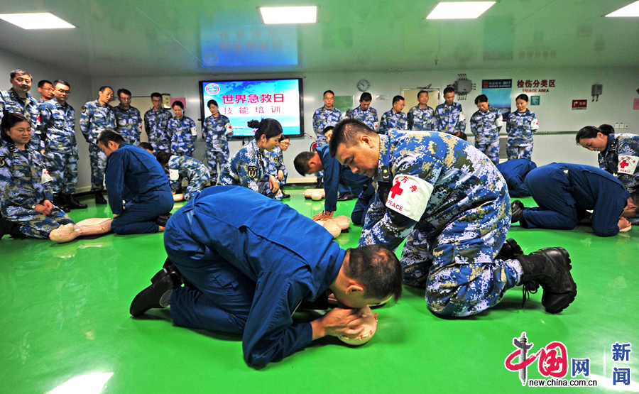 随船直升机飞行员在医护人员指导下通过心肺复苏模型练习急救技能。江山 摄