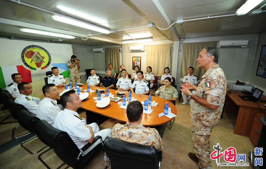中国海军和平方舟医院船官兵赴意大利驻吉布提保障基地参观交流。江山 摄