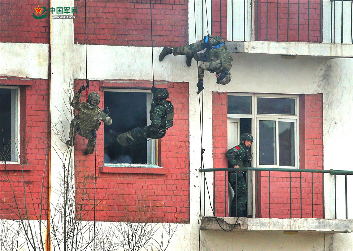 联合清剿武装恐怖团伙综合演练中,特战小组利用攀登突击车强行突入楼房实施搜剿。