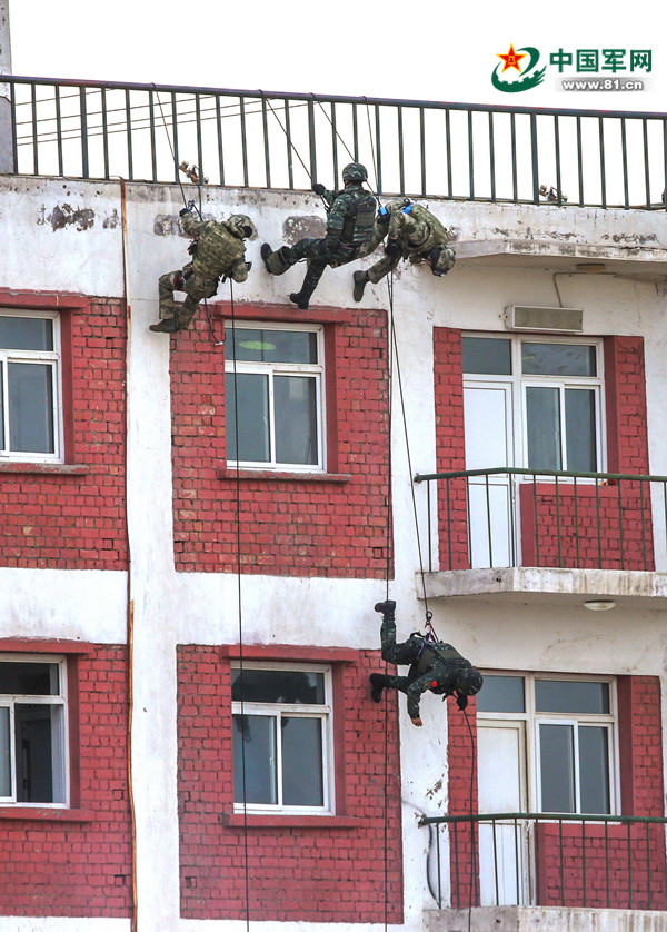 特战队员从楼顶滑降突入至房间,对恐怖分子实施搜索射击。