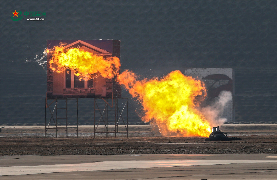 喷火手对据守房屋的”恐怖分子“实施喷火打击。