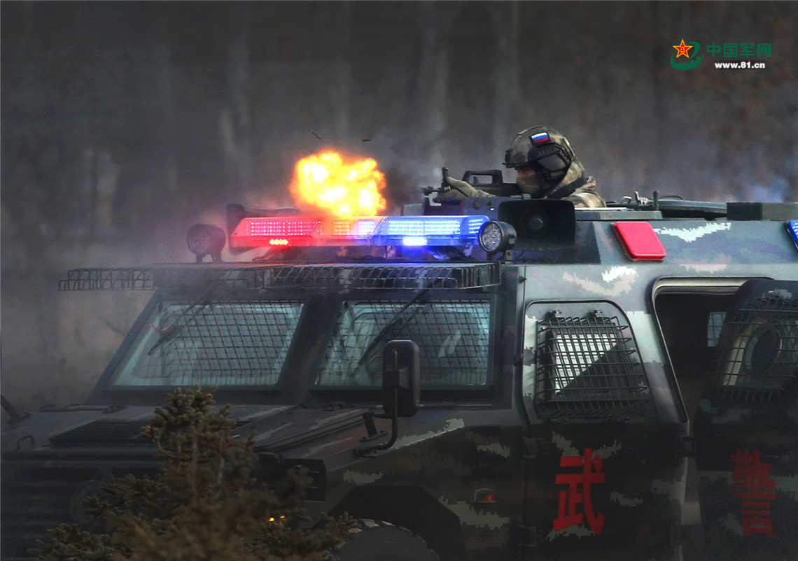 联合清剿武装恐怖团伙综合演练中,特战队员搭乘突击车机动到位,对街区实施火力打击。