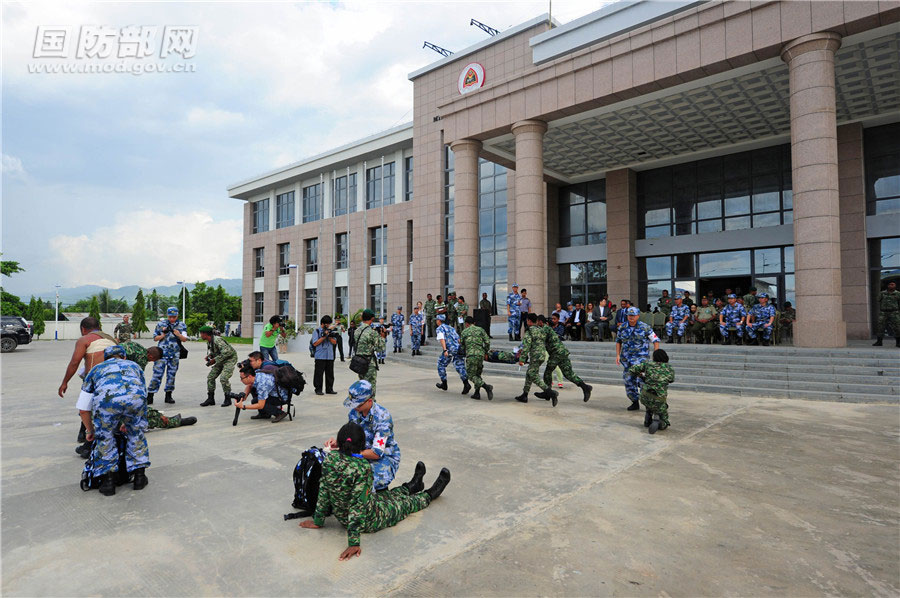 12月15日,在东帝汶国防部,中国海军和平方舟医院船医护人员与东帝汶国防军官兵进行战伤救护联合演练。江山 摄