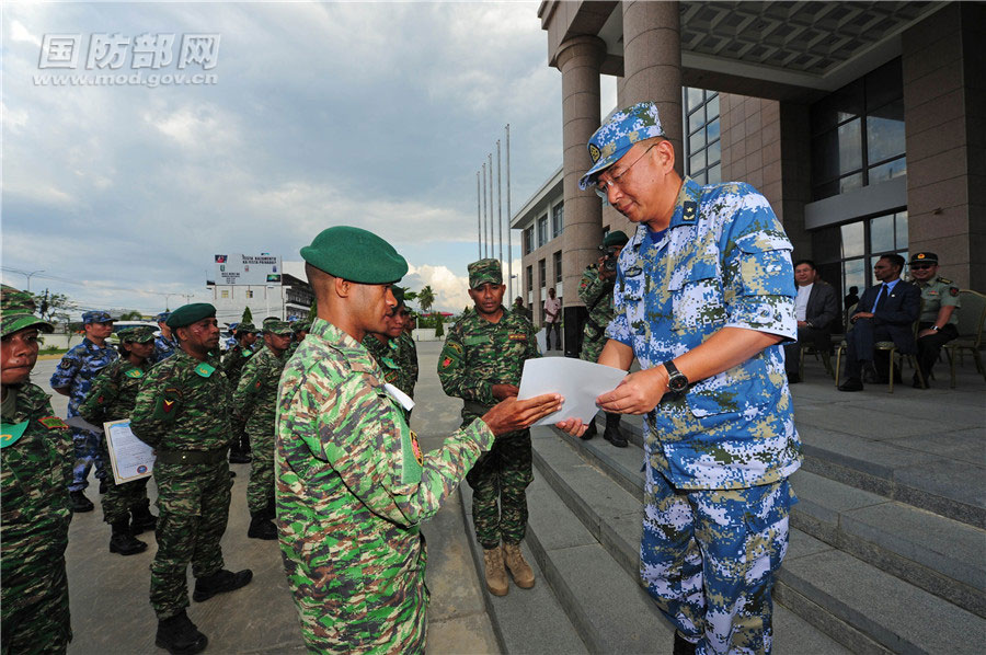 12月15日,“和谐使命-2017”任务指挥员管柏林向接受培训合格的东帝汶官兵颁发战伤技术急救培训证书。江山 摄