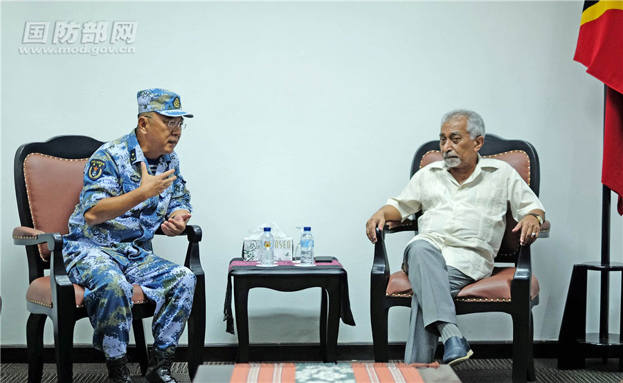 12月14日,在东帝汶总理府,东帝汶总理阿尔卡蒂里与“和谐使命-2017”任务指挥员管柏林会谈。江山摄