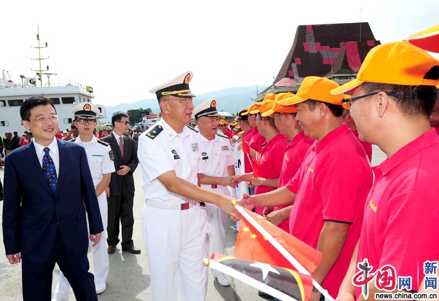 在东帝汶帝力港码头,“和谐使命-2017”任务指挥所领导与前来送行的华人华侨握手告别。江山 摄