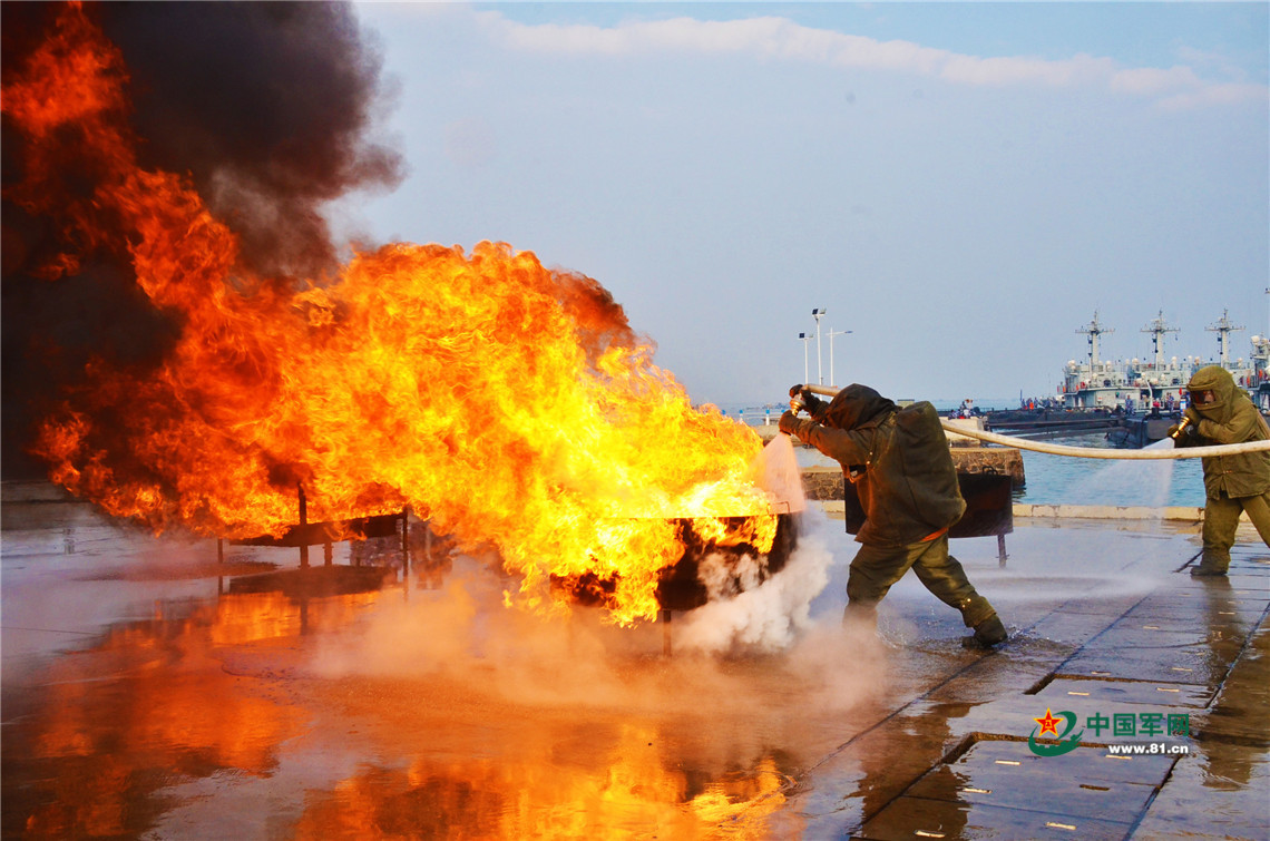 舰艇损管队灭火实操考核。