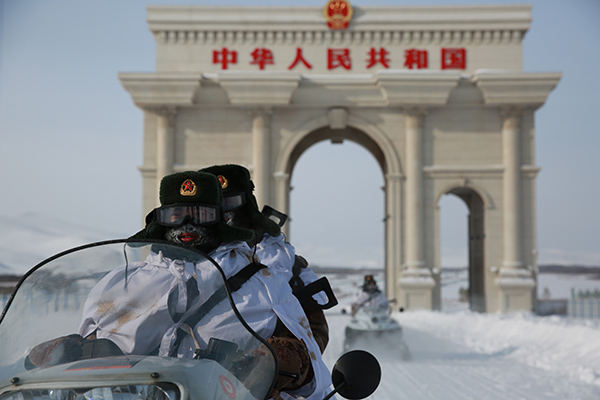 在如此寒冷的气候条件下,三角山哨所的官兵坚持巡逻执勤,从不间断。图为官兵驾驶雪地摩托经过国门。新华社记者丁鹏 摄