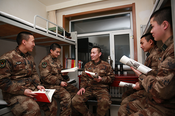 室外天寒地冻,室内暖意融融。结束了一天的巡逻、执勤和训练任务,排长孙金岗正在和官兵们讨论读书心得,《习近平的七年知青岁月》是他们最爱看的书。新华社记者丁鹏 摄