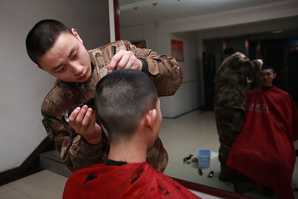 战士唐天龙是连队的小能人,别看他年纪不大,帮战友理发的时候俨然一个“老把式”。新华社记者丁鹏 摄