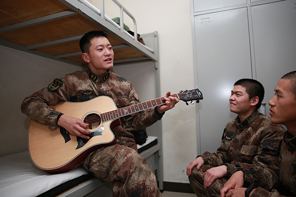 中士杨洪入伍前就是一个音乐达人,他组织了几个热爱音乐的战友在连队创建了“三角山乐队”,每逢节假日他们都会为战友表演精彩的节目。新华社记者丁鹏 摄
