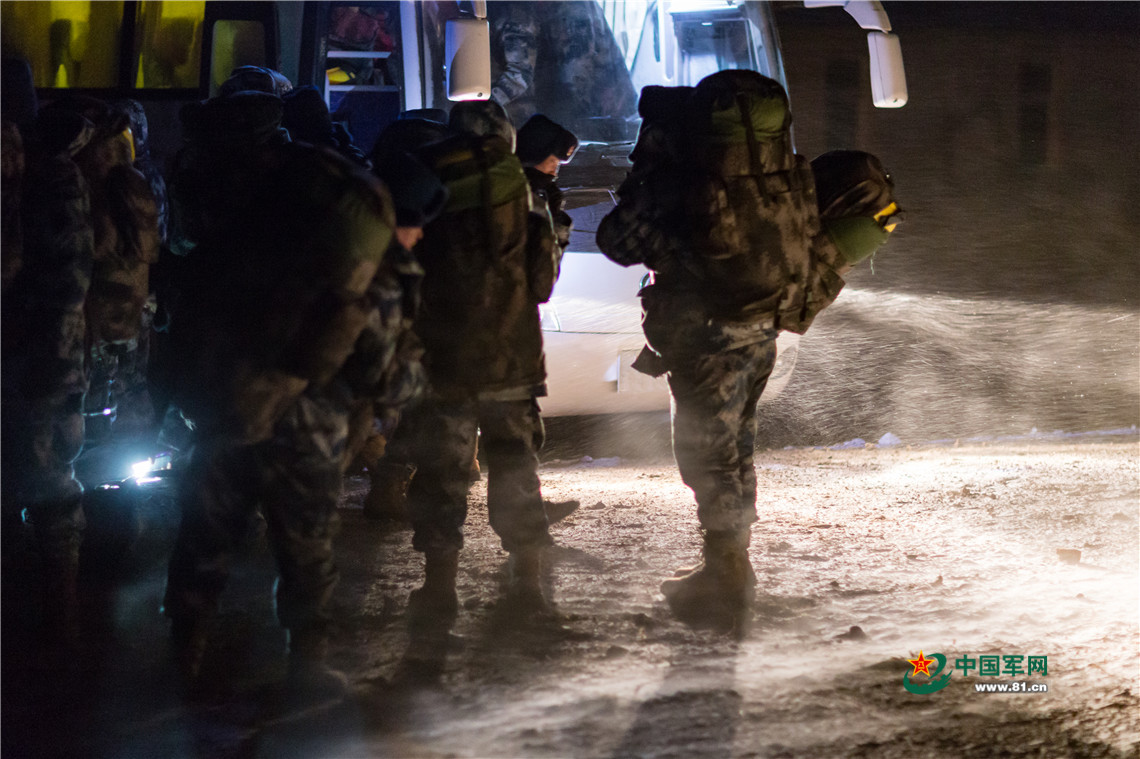 官兵在风雪中进行物资卸载,准备宿营。