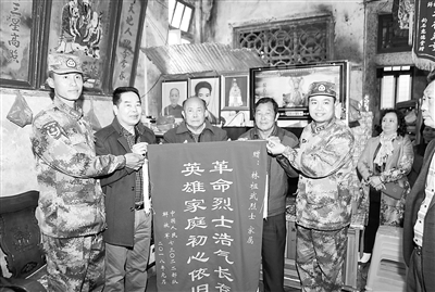 旅官兵代表给战斗英雄林祖武的家属赠送锦旗。