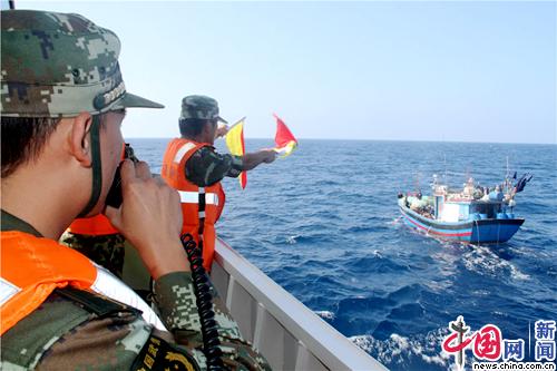 中国海警执勤舰艇驱离外方越界捕捞渔船。