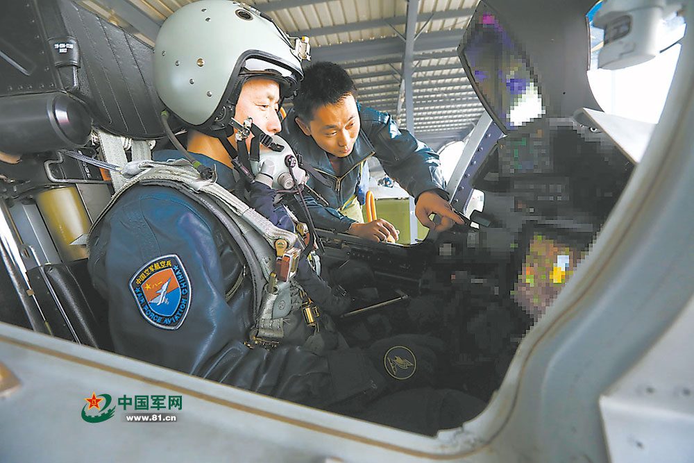 “新”教官王体指导“老”学员刘晓鹏(前)进行座舱实习。