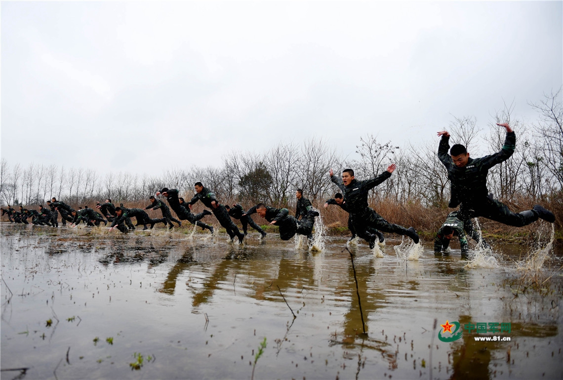 2018年3月20日,安徽合肥,武警特战队员在泥潭中进行实战对抗训练。