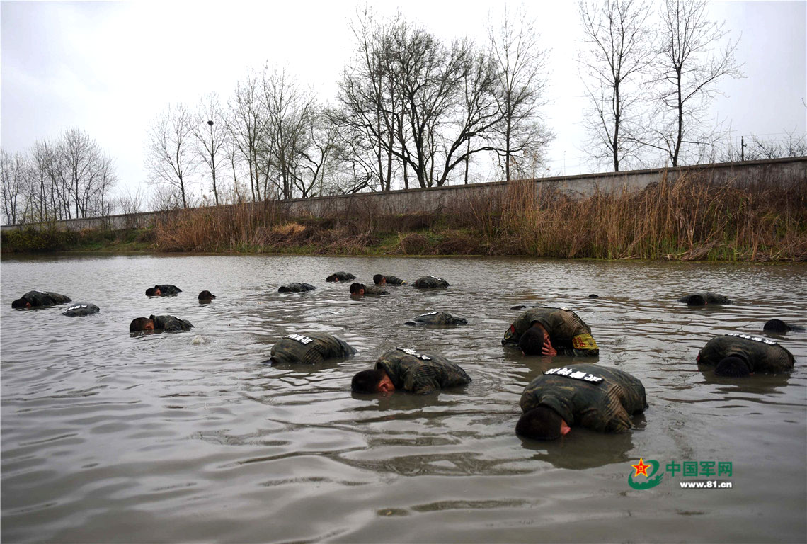 2018年3月20日,安徽合肥,武警特战队员在污浊水塘中进行憋气训练。