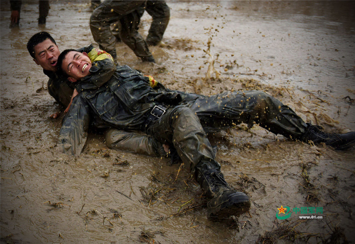 2018年3月20日,安徽合肥,武警特战队员在泥潭中进行实战对抗训练。