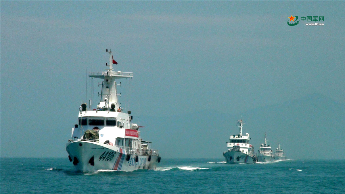 海警舰艇进行单纵队列编队航行训练。