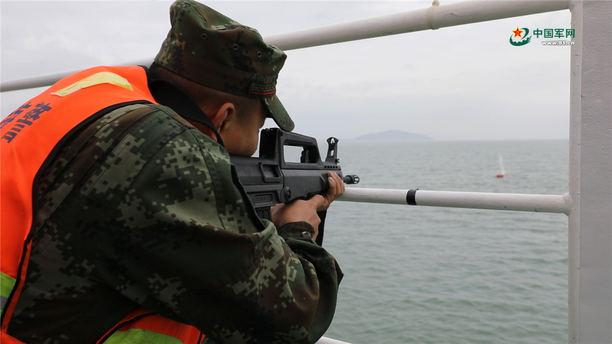 海警官兵组织开展海上95-1式自动步枪射击。
