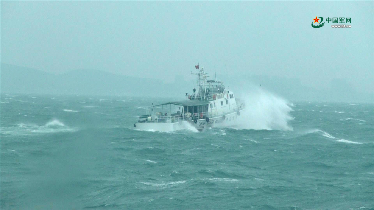 海警舰艇大风浪航行。