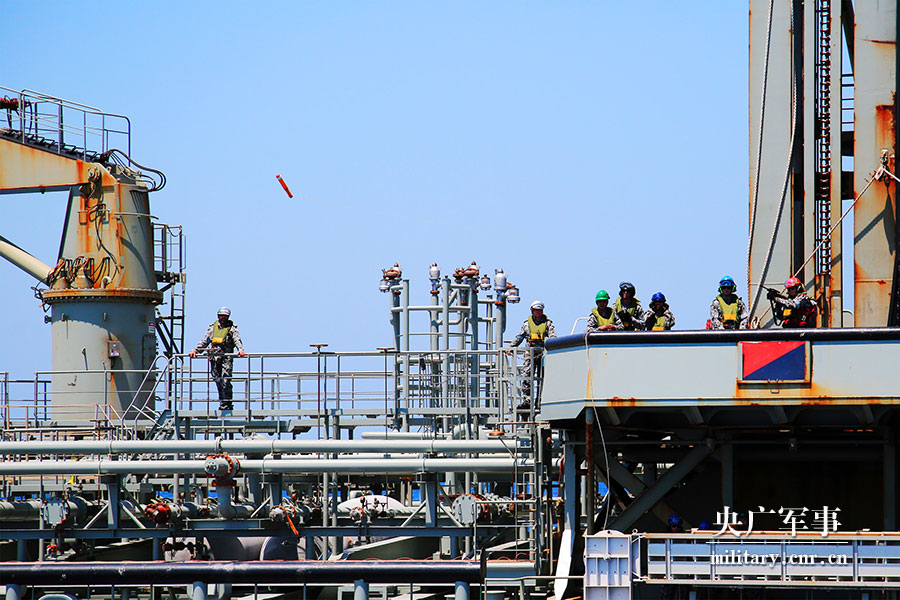 澳大利亚“天狼星”号补给舰通过撇缆枪发射引缆到黄山舰。徐广 摄