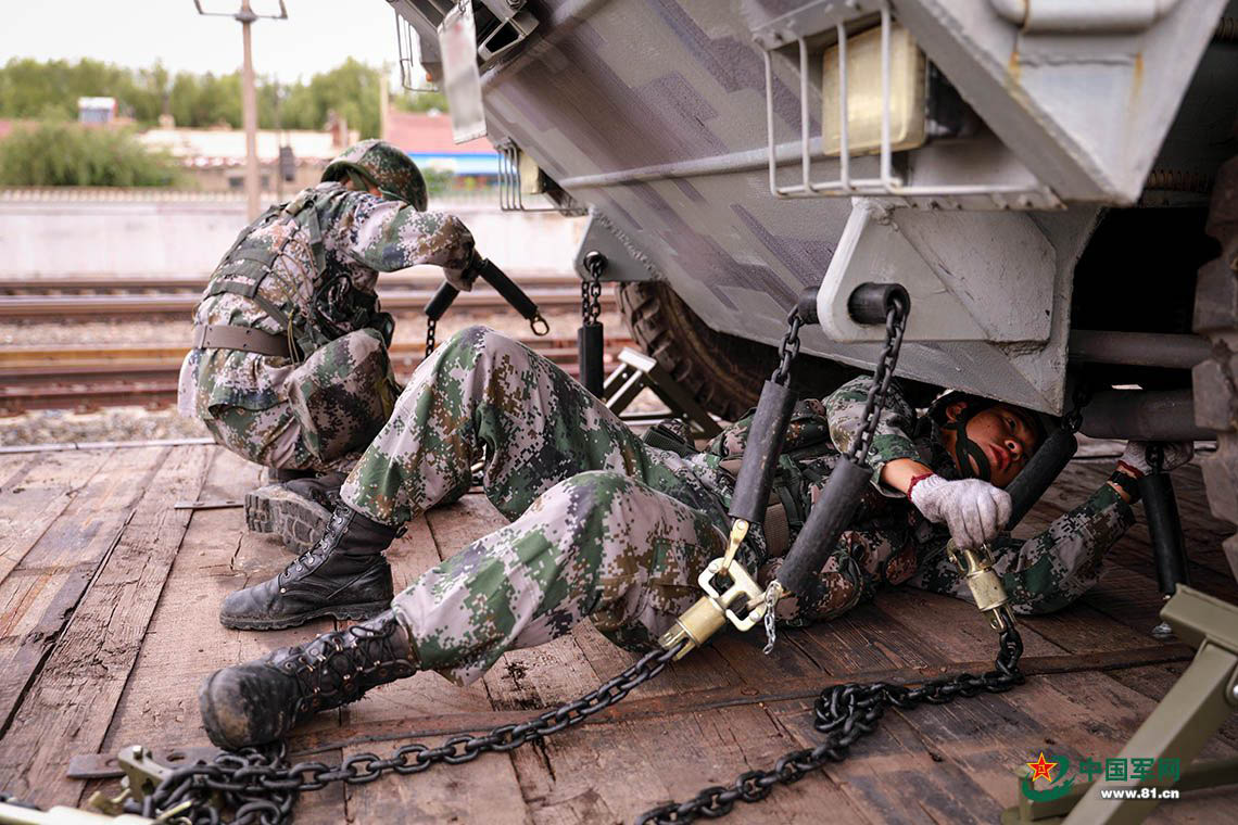 官兵对导弹战车进行捆绑固定。