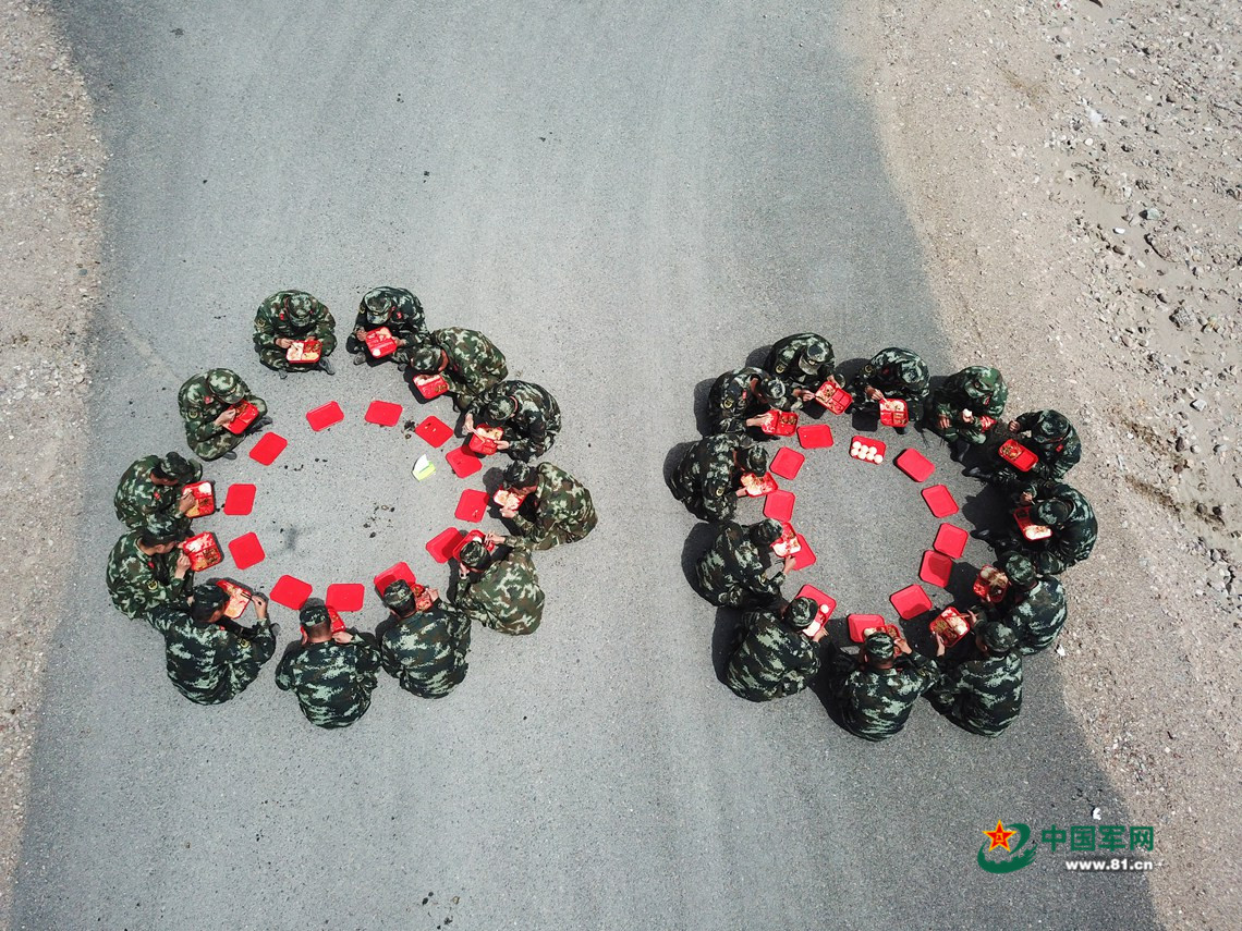 9月12日,该支队官兵在海拔4200米的施工一线吃午饭(航拍图)。