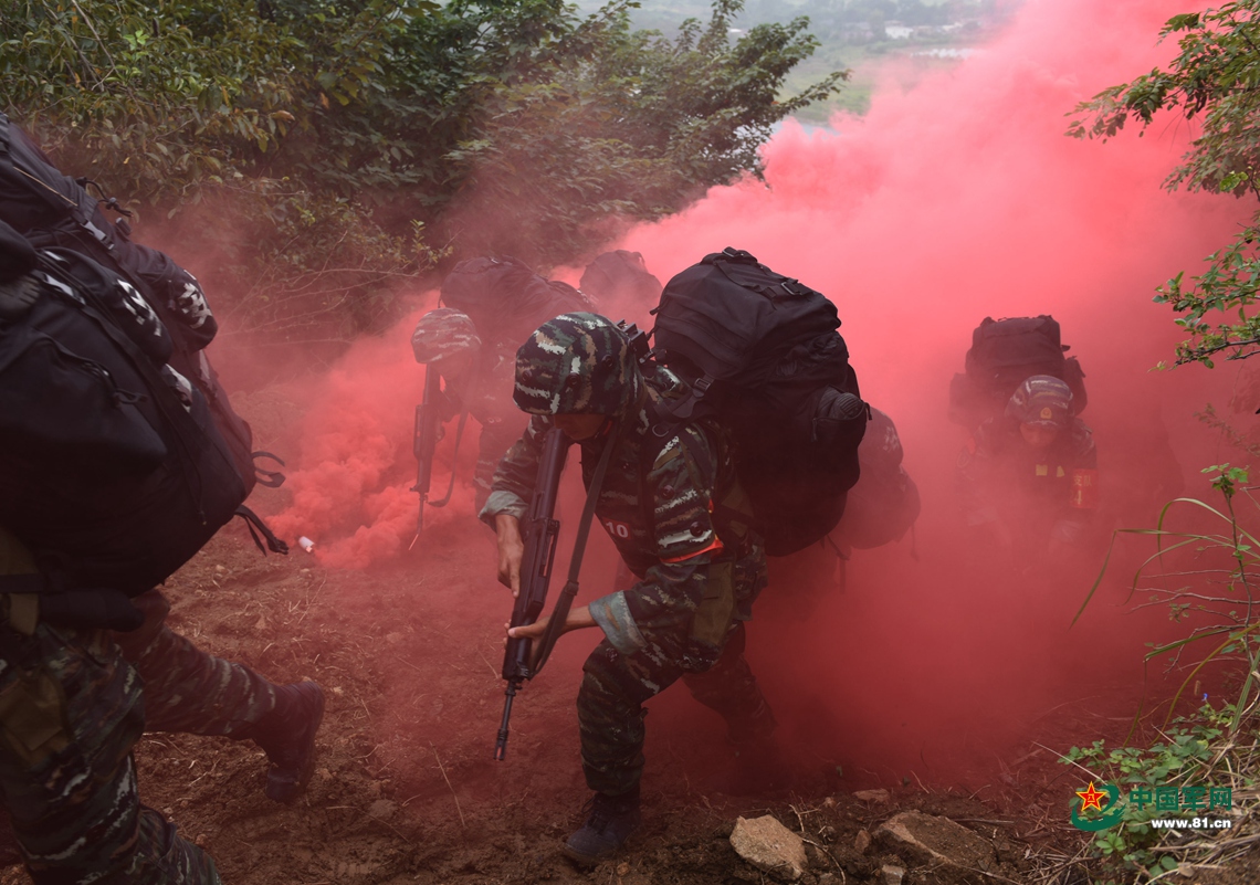 2018年9月19日,安徽合肥,武警特战队员在某山地奔袭通过“染毒”地带。