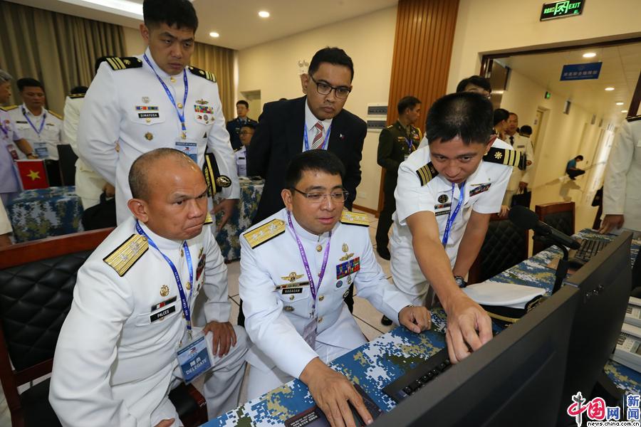 10月22日,中国-东盟“海上联演-2018”演习开幕式在湛江某军港举行。开幕式后,第一次演习计划会在岸基联合指挥部召开。东盟各国观摩团参观了岸基联合指挥部和中囯海军某新型导弹驱逐舰。张雷 摄