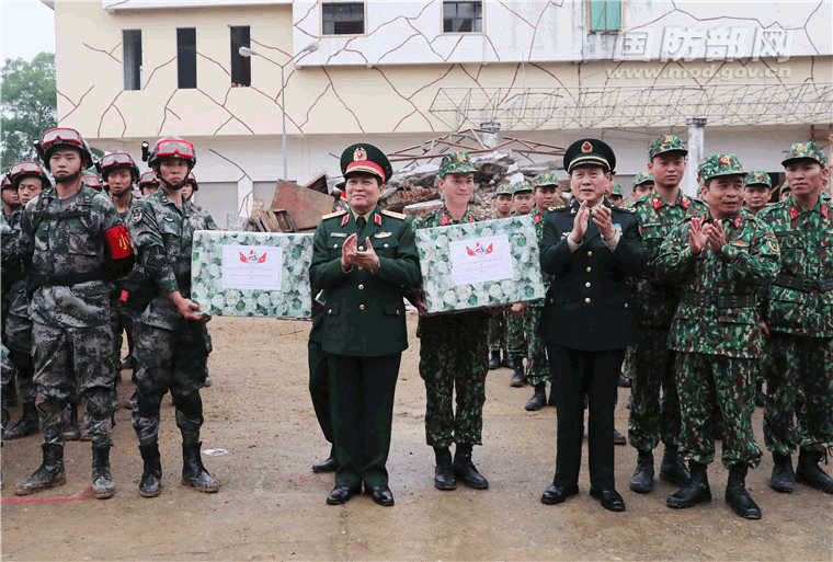 11月20日,魏凤和与吴春历共同观摩中越两军灾害救援联合演练。图为魏凤和与吴春历向中越两军参演官兵赠送礼品。李晓伟 摄