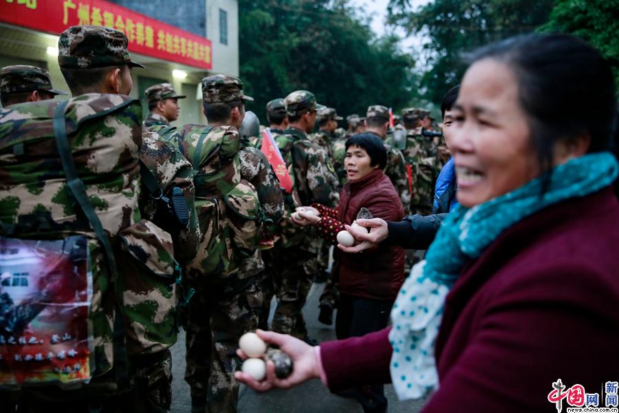 拉练途中乡亲们给官兵送鸡蛋,战士们遵守纪律不拿群众一针一线。