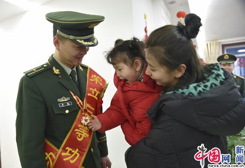 “爸爸,你的奖章真好看,我长大了也要当功臣。”在苏航家中,看着妈妈为爸爸整理绶带,小女儿迫不及待爬到爸爸身上,摸摸这里,看看那里,稚嫩的童音引发大家齐声称赞。随后,军地领导共同将一块“功臣之家”牌匾挂在了苏航的大门口前,永远定格这份最珍贵的荣誉。