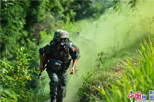 在特战小队综合战术课目中,参赛队员正在穿越染毒区域。 王肸 摄