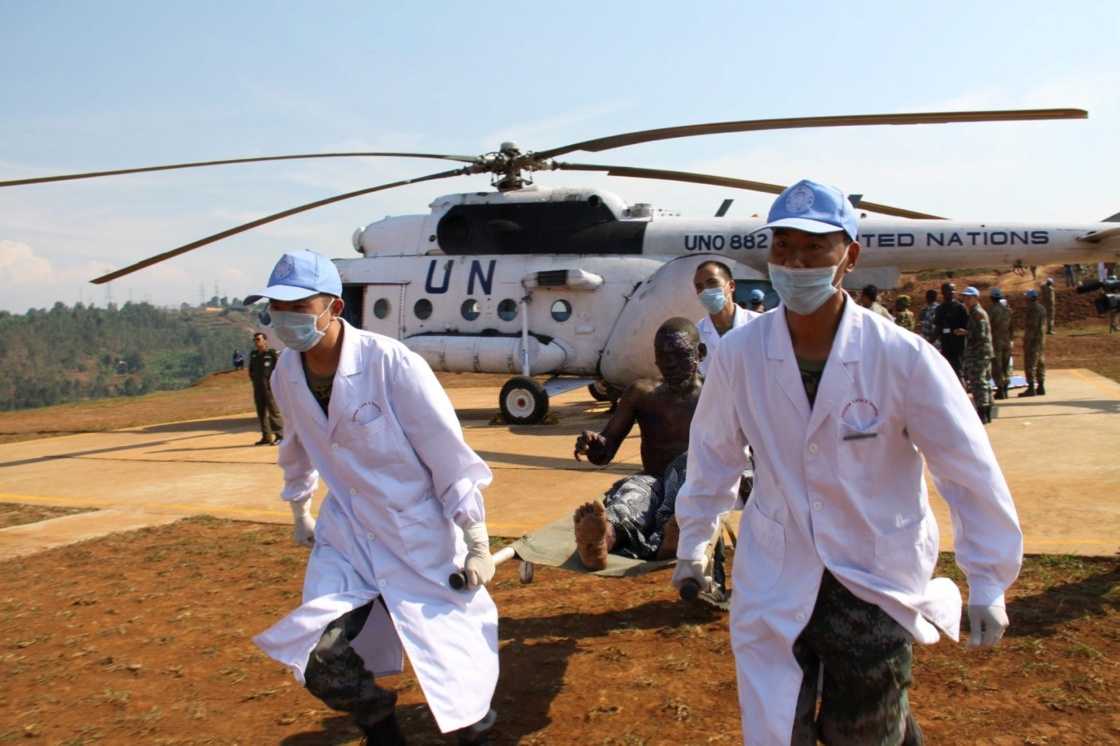 这是2010年7月3日,在刚果(金)南基伍省布卡武机场,中国赴刚果(金)维和医疗分队医护人员搬运油罐车爆炸中的受伤者。新华社发(郭云飞摄)