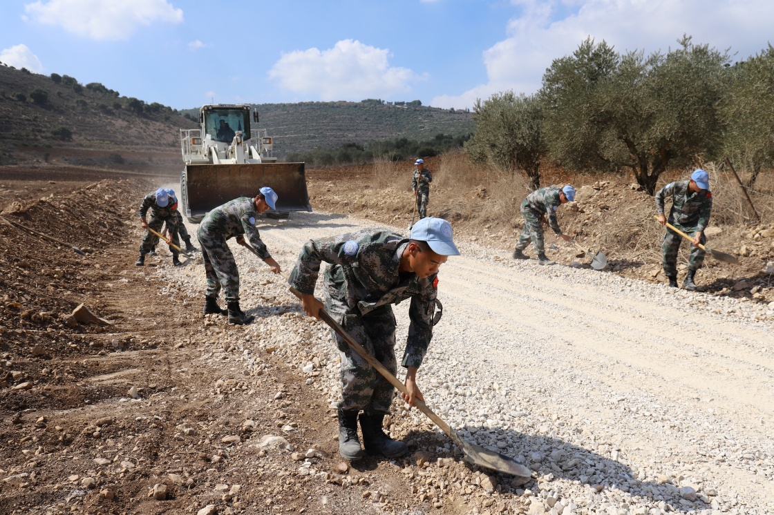 这是2018年10月10日,在位于黎巴嫩南部靠近以色列边境的一处村庄,中国维和官兵在修路过程中修整边沟。新华社发(蒙卓霖摄)