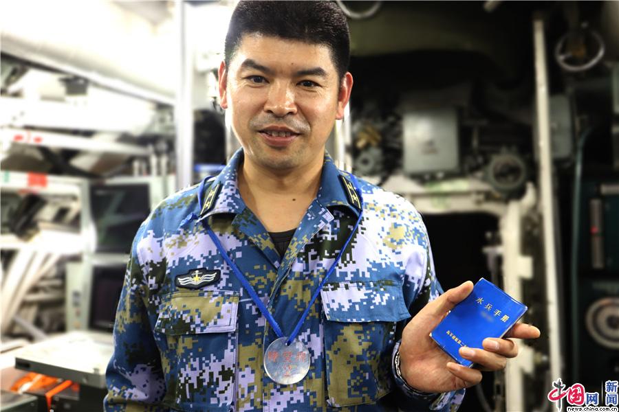 记者手持《水兵手册》,佩戴瞭望牌留影。